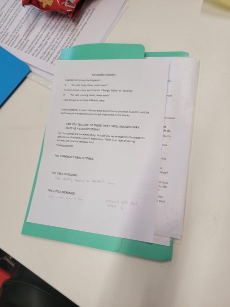 When the students arrived, the room looked like a miniature creative writing studio. Each participant had a folder containing worksheets, prompts and ideas. One of the students commented that they loved having “everything organised for us,” adding that they felt “very welcome” because the session had clearly been prepared with care.