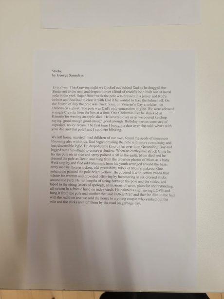 A highlight of the session was the exploration of how setting shapes tone. The students were surprised by how little information they needed to imagine a world. When asked to describe the “yard” in a George Saunders’ story (see above), they immediately pictured houses, neighbourhoods and even moods, despite being given almost no physical details about the setting, other than a description of a pole put in the yard.