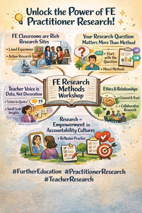 As part of the British Library’s Learning Skills Research Network, Debbie Bogard and I co-led an online Learning and Skills Research Network session exploring research methods and data collection in Further Education. At first I joked that research methods might not be the most thrilling topic. Yet the discussion quickly showed the opposite. When research begins with real classrooms, real teachers, and real learners, it becomes deeply engaging. The session centred on a simple but powerful idea. Small scale practitioner research can generate profound insight. FE classrooms are rich research sites where teachers already observe patterns, dilemmas, and possibilities every day. Research is not something distant or purely academic. It begins with curiosity about practice. Five themes emerged strongly. First, FE classrooms contain valuable knowledge worth studying. Second, the research question matters more than the method. Third, teacher voice is not decoration but a form of data that reveals how systems actually operate. Fourth, ethics sit at the centre of practitioner research because education is fundamentally relational. Finally, research can be empowering. In systems shaped by accountability pressures, inquiry allows teachers to step back, reflect, and understand their work more deeply. The workshop reminded us that practitioner research is not about grand projects. It is about paying attention to practice and learning from it together.